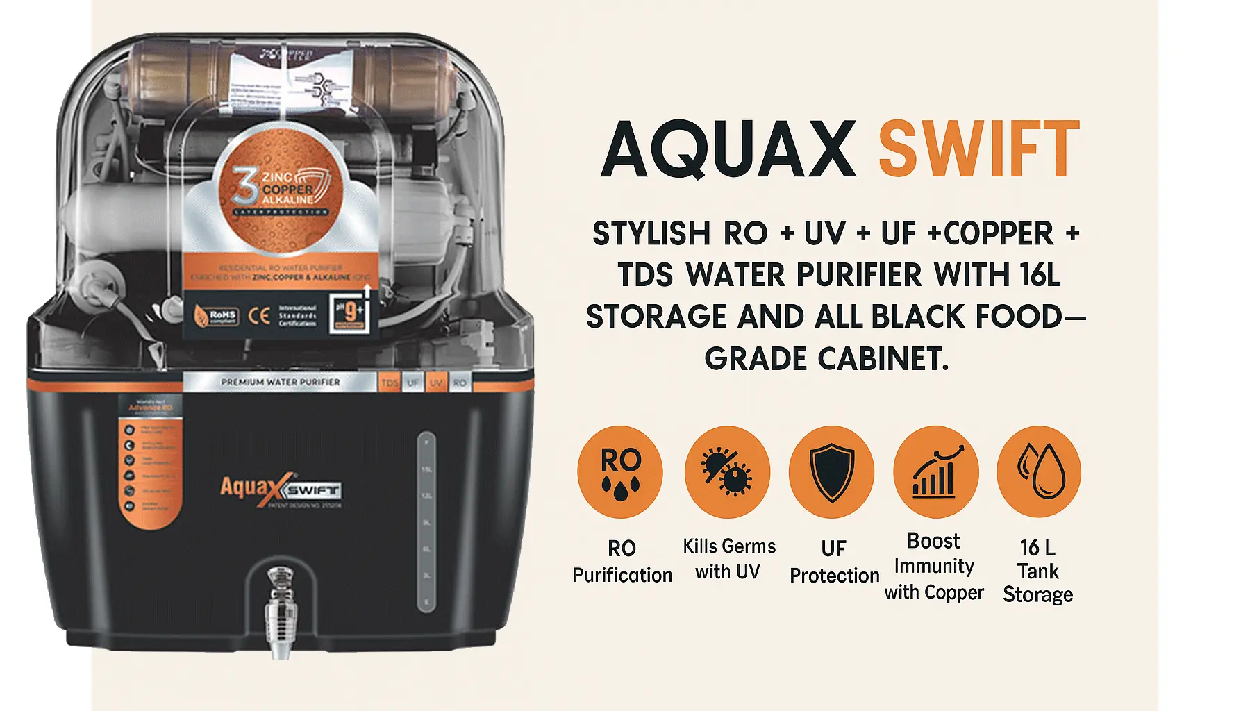 The Aquax Swift is a powerhouse of purification wrapped in a stunning all-black food-grade cabinet. Built for performance and style, it features RO + UV + UF + Copper + TDS Controller technology, ensuring every drop you drink is pure, mineral-rich, and safe. With its bold 16-liter storage tank, it’s perfect for homes that value both health and aesthetics.